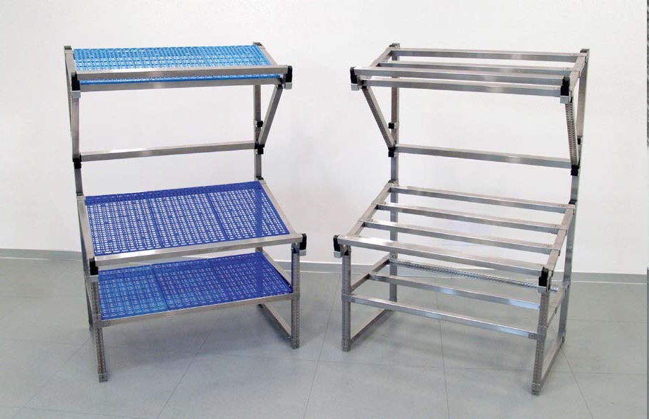 bancarella per l’esposizione della frutta, molto funzionale grazie ai tre livelli di piani in grado di supportare cassette e contenitori di diversa dimensione e allo stesso tempo esteticamente gradevole. ----------------------------- stainless steel stand with three display levels, featuring modern lines and a captivating design. the display levels can be supplied with slatted stainless steel profiles or with plastic shelves. all components are compatible for use within the food sector