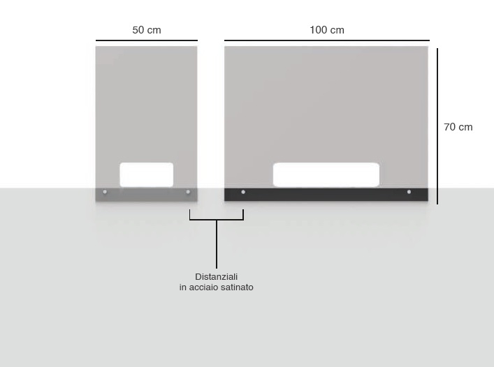 caratteristiche struttura da fronte banco formato 100x70 cm realizzata in plexiglass trasparente anti-urto e completa di distanziali in acciaio satinati. disponibile a richiesta anche nella versione con grafica stampata a 4/0 colori + bianco coprente. dimensioni e info
