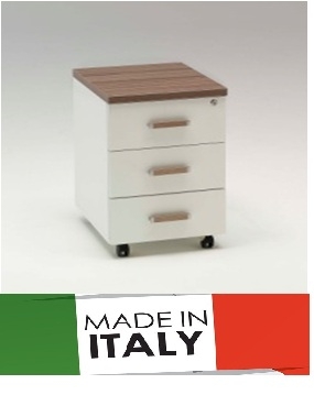 cassettiera a 3 cassetti su ruote, 1 cassetto alto con serratura, spedita smontata , mis. 41 x 50 x h 55 . serie operativa realizzata in melaminico en1 , piani di lavoro sp. 25 mm con bordo in abs 2 mm raggiato . versione con struttura legno , fianchi da sp. 25mm nel colore bianco . disponibile 2 versioni metallo : con gamba a ponte in tubolare rettangolare 60x30 , verniciata epossidico col. bianco ;con piani rialzati per agevolare il passaggio dei cavi , con gamba a t con carter passacavi in acciaio stampato , verniciata epossidico col. alluminio la serie e' disponibile in 4 finiture : noce canaletto , bianco , ciliegioe rovere chiaro . completa di armadiature , casellari e cassettiera su ruote con serratura , forniti smontati .