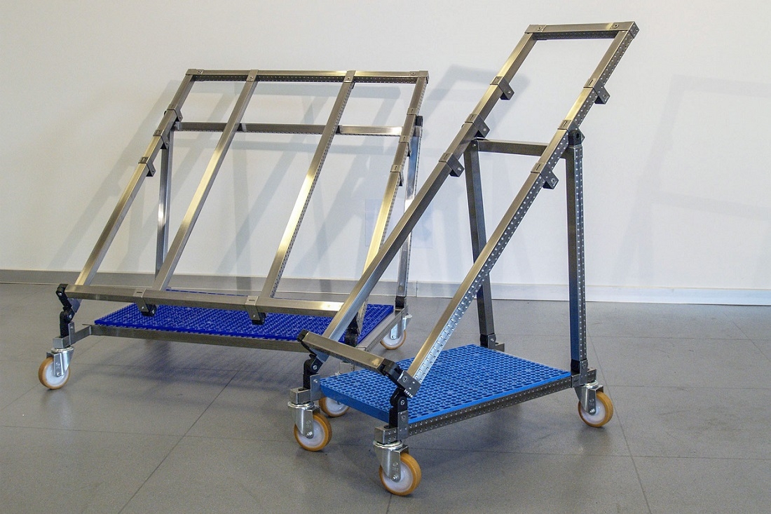 caratteristiche - struttura: telaio in acciaio inox; - giunture & accessori (tappi, ruote e giunti): poliammide e polipropilene; - rivestimento ruote: poliuretano - (diametro ruote 100 mm). - dimensione componente montato (lxpxh) mm: 440x800x1240 mm (nella posizione più alta) - dimensione imballo (lxpxh) mm: 1333x457x330 mm
