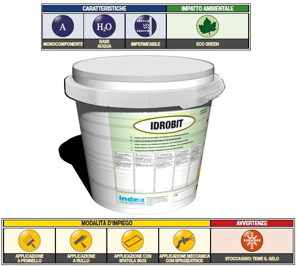 idrobit- monocomposto in pasta pronto all'uso, elastomero bituminoso a base acqua, rivestibile con malte cementizie e verniciabile, per nuove impermeabilizzazioni e riparazioni di vecchi manti bituminosi