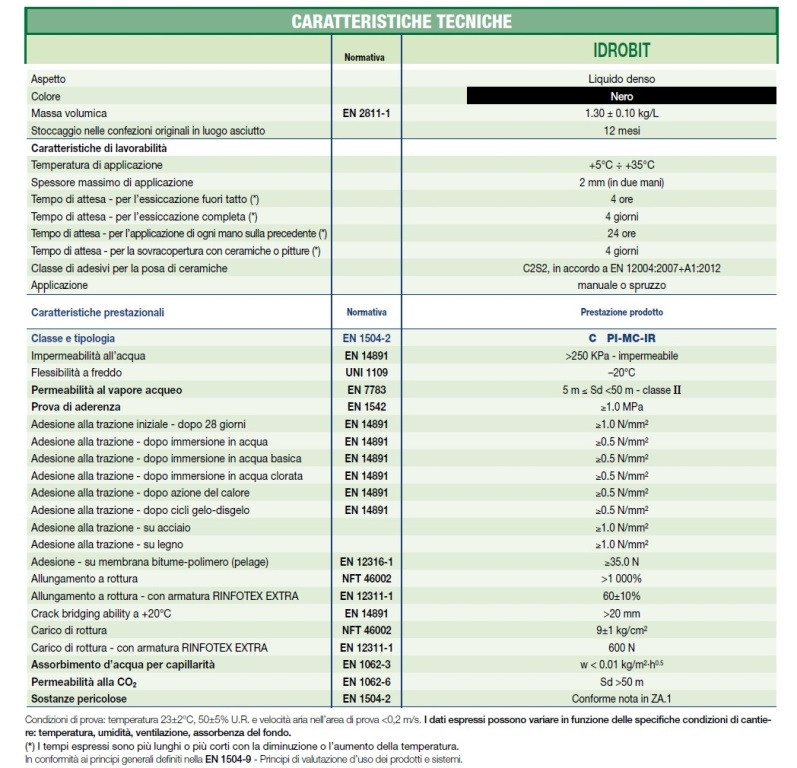 campi d'impiego idrobit è utilizzato per realizzare impermeabilizzazioni sia in verticale che in orizzontale su superfici di calcestruzzo, legno, ceramica, isolanti e membrane bituminose. È impiegato per impermeabilizzare solette di calcestruzzo, fondazioni, particolari di difficile esecuzione in tetti o terrazze, bagni, ecc; per la riparazione di manti bituminosi e/o la relizzazione di impermeabilizzazione in genere anche a vista. grandi superfici. per superfici superiori ai 50 m² o supporti sollecitati, si consiglia di armare il prodotto con rinfotex extra (armatura in tessuto non tessuto in poliestere rivestito, si stende e si ingloba nell’impermeabilizzazione per ottenere migliori caratteristiche di resistenza dell’impermeabilizzazione), annegando l’armatura nella prima mano ancora fresca. le sormonte dell’armatura dovranno essere di circa 10 cm. scheda tecnica
