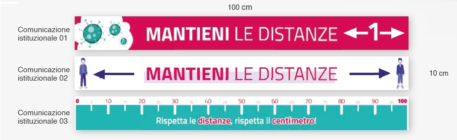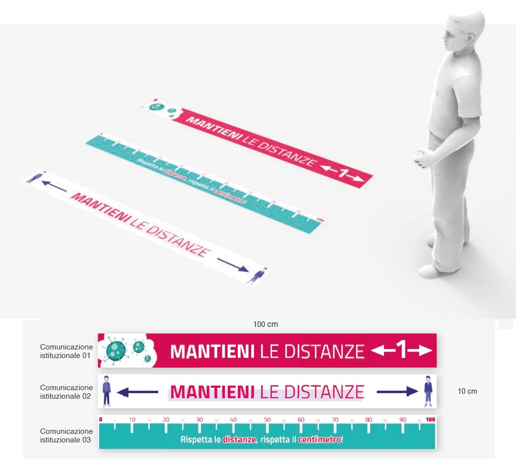 caratteristiche strisce calpestabili adesive f.to 100x10 cm con protezione antiscivolo, superficie sanificabile. a scelta tre grafiche istituzionali in pronta consegna o personalizzabili con la vostra grafica.