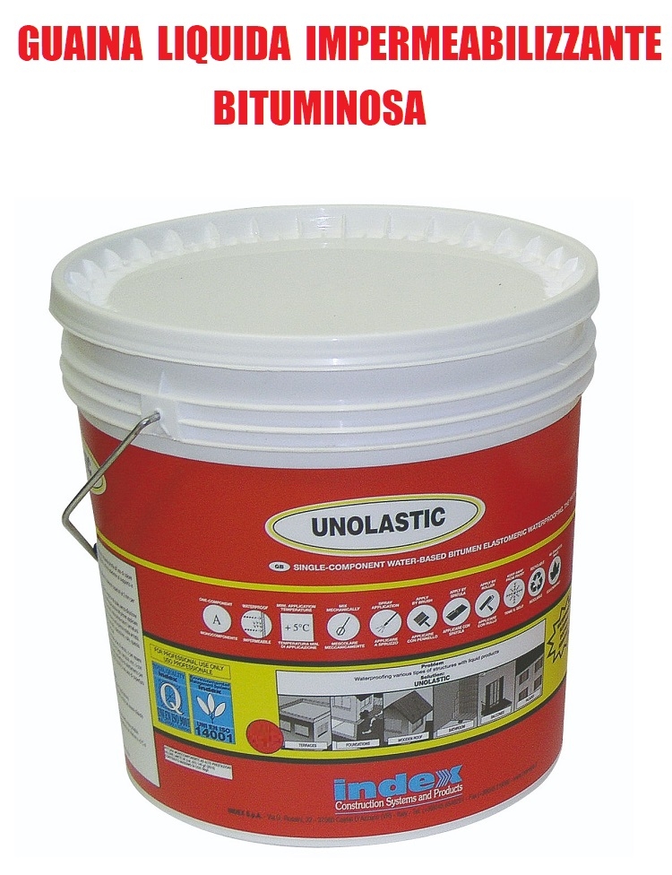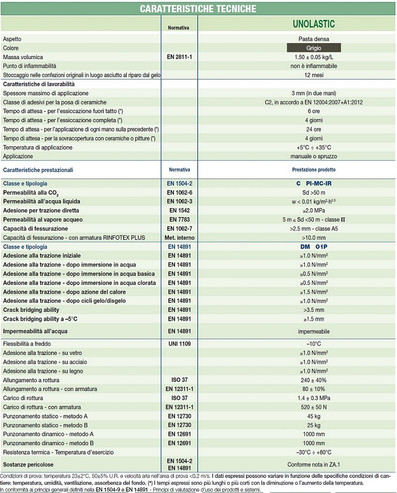 unolastic è una pasta cremosa monocomponente in soluzione acquosa pronta all’uso disponibile in colore grigio, nero e marrone cotto, ottenuta con la miscelazione di particolari resine sintetiche elastiche, speciali bitumi e filler al quarzo ad elevata resistenza all’acqua. pronto all’uso, non serve né acqua, né corrente elettrica aumentando quindi la velocità e la facilità di posa, in fase di posa quindi non è necessario l’utilizzo di miscelatori elettrici e nel caso in cui si debba interrompere l’applicazione, basterà chiudere il secchio, per ritrovare successivamente il prodotto ancora perfettamete utilizzabile. la pasta così ottenuta, una volta essiccata è caratterizzata da elevata elasticità, ottima adesione al supporto e impermeabilità.